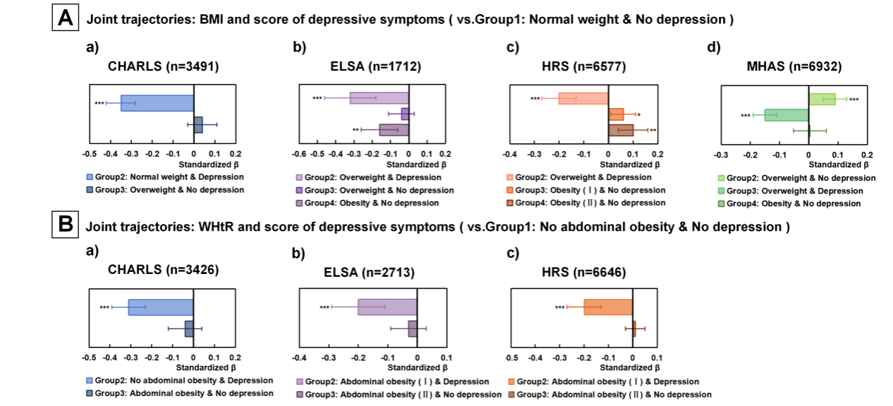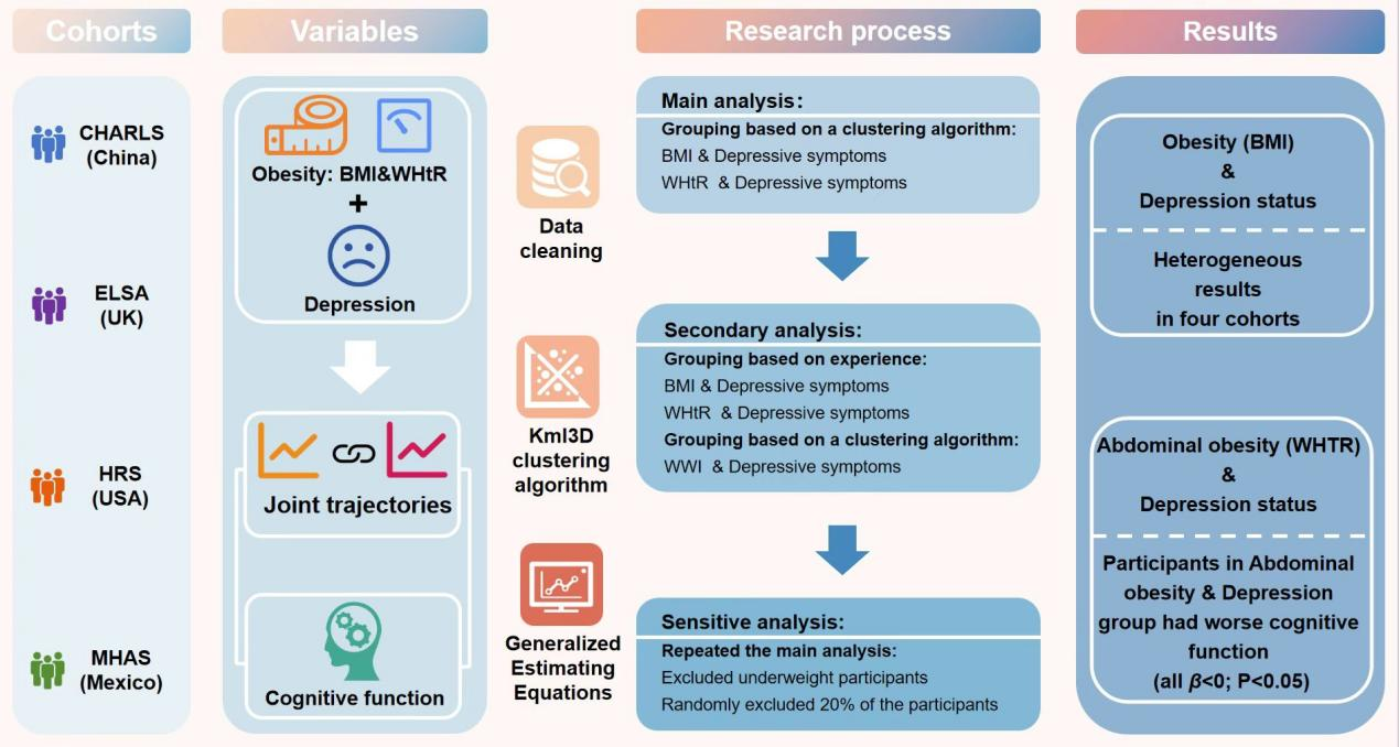 研究采用四个具有全国代表性的队列(CHALRS,中国;ELSA,英国;HRS,美国和MHAS,墨西哥),共纳入114,633名45岁以上的参与者,涵盖多种身体测量与认知心理测评指标。使用Kml3D聚类算法和广义估计方程(GEE)分析参与者的肥胖/腹部肥胖与抑郁的共变轨迹与认知功能变化趋势的关系。