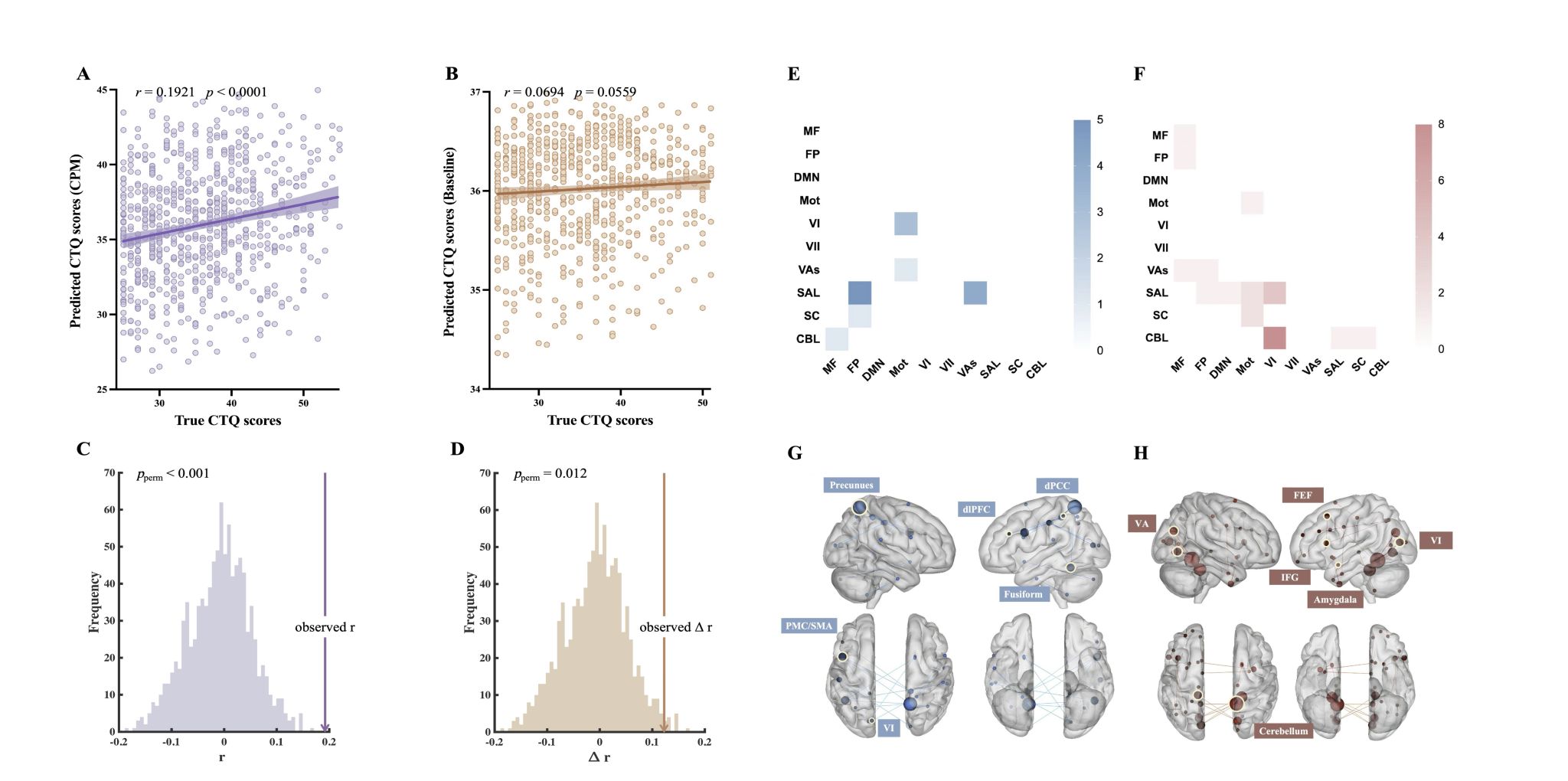 图2 脑分析结果图:A.基于CPM与LASSO模型对CTQ得分的预测(r = 0.1921,p < 0.0001);B.仅包含协变量(年龄、性别、头动)的基线模型预测结果(r = 0.0694,p = 0.0559);C.CPM与LASSO模型预测的相关系数置换分布显示,真实r值位于分布的极右端(pperm < 0.001),具有显著预测效应;D.CPM模型相较基线模型的r值提升(Δr)显著(pperm = 0.012),表明预测性能的提高源于功能连接特征,而非噪声;E.与童年创伤有关的负网络;F.与童年创伤有关的正性网络(每个矩阵的对角线表示网络内部的连接数量,颜色越深表示连接越多);G.与童年创伤呈负相关的连接的玻璃脑图,H.与童年创伤呈正相关的连接的玻璃脑图,球体越大,表示该脑区与更多的节点相连。