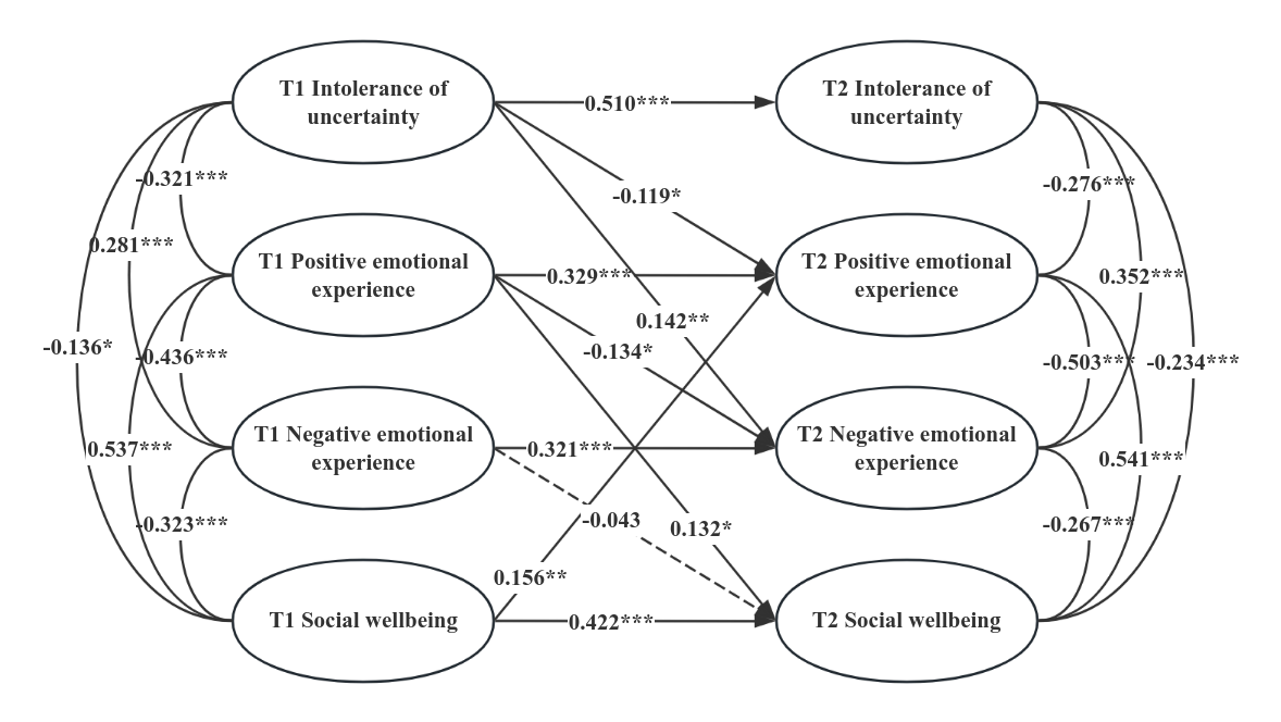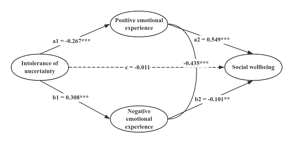 研究基于844名大学生的横断面数据和324人的两年追踪样本,发现不确定性容忍度越低,个体越容易经历更多负面情绪、更少积极情绪;积极情绪和消极情绪在不确定性容忍度与社会幸福感之间起到中介作用(图2)。