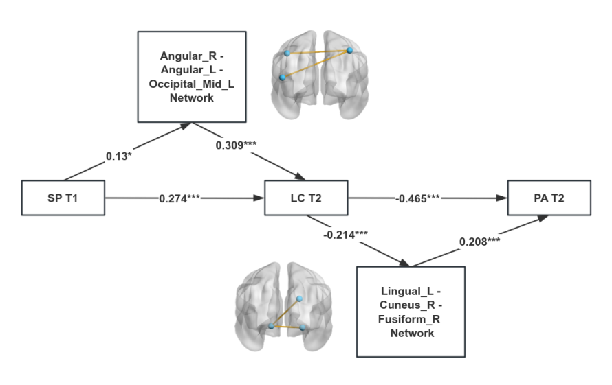 脑功能连接分析进一步发现,右侧角回与左侧枕中回的功能网络在社交恐惧发展为失控感中起中介作用;而左侧舌回与右侧楔叶、梭状回的功能连接则在失控感影响积极情感中发挥作用。