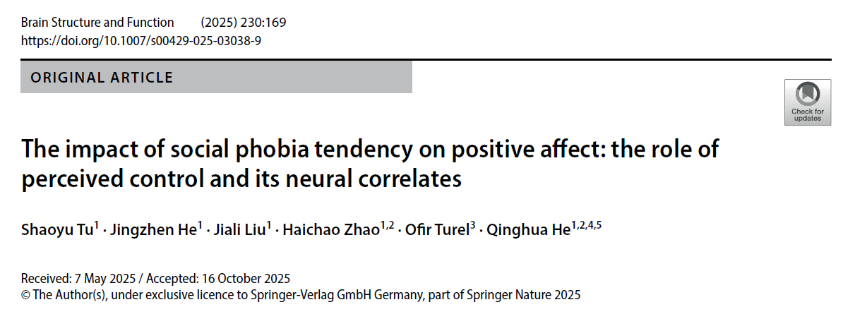 另一项发表于《Brain Structure and Function》(图4,SCI收录,解剖与形态学领域1区期刊,五年影响因子3.2)的研究《The Impact of Social Phobia Tendency on Positive Affect: The Role of Perceived Control and Its Neural Correlates》,则从脑科学角度揭示了社交恐惧影响积极情感的认知与神经路径。