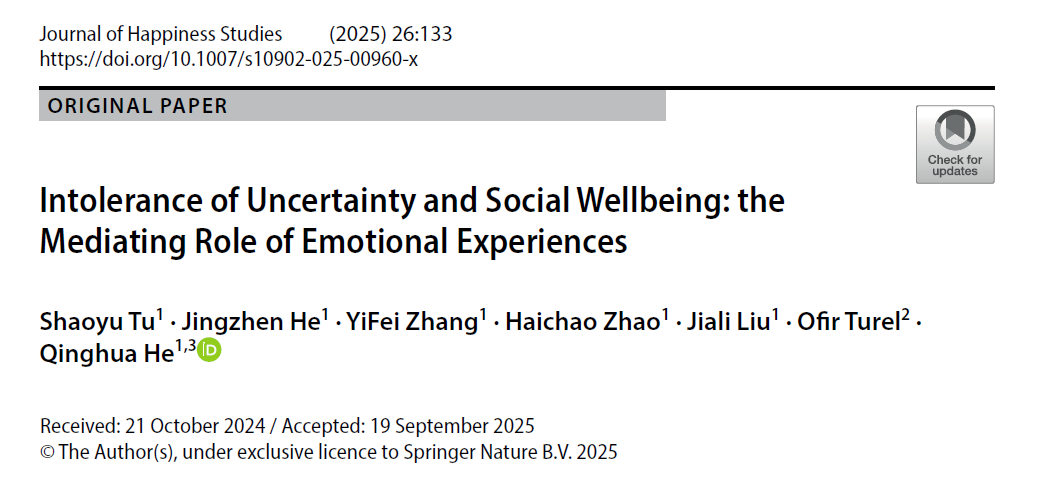 发表在《Journal of Happiness Studies》(图1,SSCI收录,五年影响因子4.7)上的论文《Intolerance of Uncertainty and Social Wellbeing: The Mediating Role of Emotional Experiences》首次系统探讨了“不确定性容忍度”如何通过情绪体验影响个体的社会幸福感。