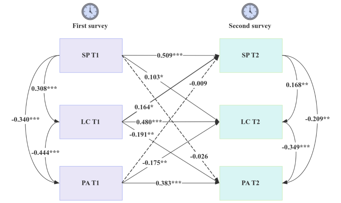 纵向分析进一步证实,早期的积极情绪能够预测两年后的社会幸福感,显示出积极情绪在长期心理健康中的关键作用(图3)。