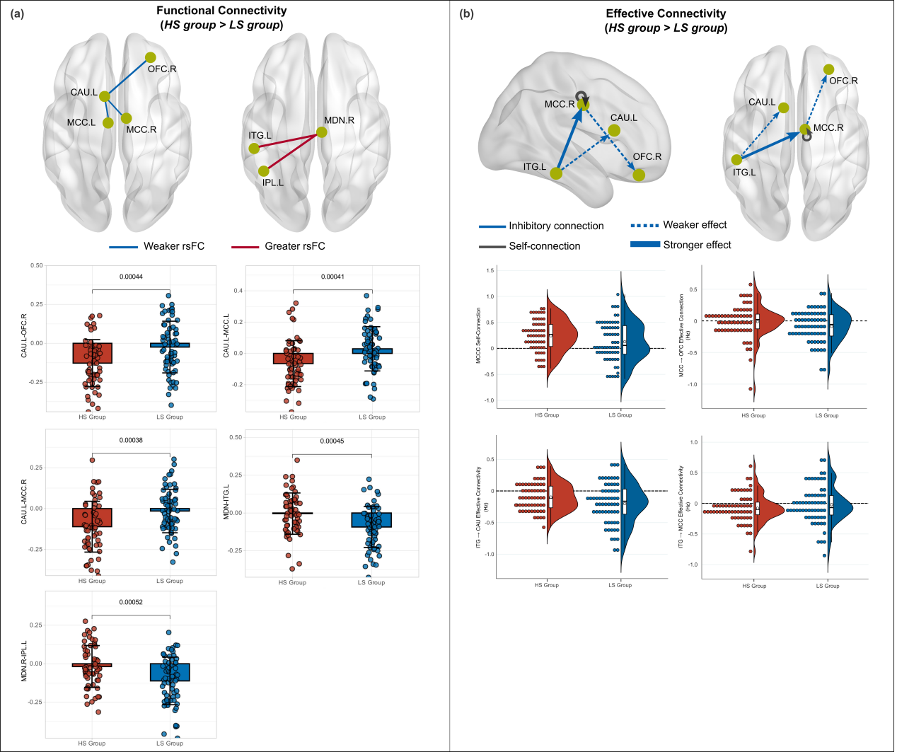 图1 (a)功能连接结果;(b)有效连接结果