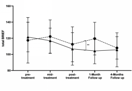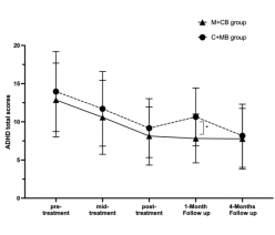 图3. 折线图显示ADHD症状和EF缺陷在治疗前、治疗中、治疗后、随访1个月和4个月时的评分变化