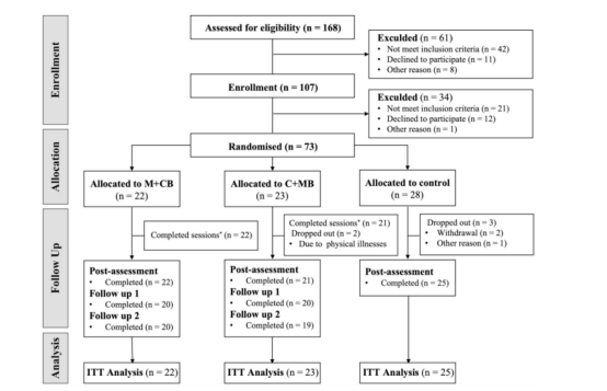 本研究采用随机对照试验(Randomized Controlled Trial,RCT)设计,纳入6-12岁ADHD儿童70名(见图1),共分为三个组别,包括以正念为主和以认知策略为主的两个干预组和一个对照组。其中,干预组的儿童接受了为期12周的干预训练,每周进行2次,每次至少60分钟,每组包含6-8名儿童。研究结合标准化量表评估与多种认知任务,从症状表现和认知功能两个层面,全面评估干预效果及其持续性。
