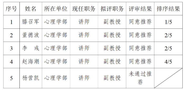 根据《西南大学关于开展2025年专业技术职务申报工作的通知》和《西南大学2025年专业技术职务学术评审阶段有关事宜的通知》要求,经个人申报、学部审查、申请人陈述、学部学术委员会评审推荐等程序,现将心理学部学术委员会2025年专业技术职务学术评审结果公示如下:
