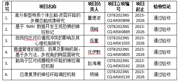 按照重庆市科研项目相关管理规定,根据我校科学技术发展研究院工作安排,心理学部近期组织专家组对我部承担的重庆市自然科学基金项目进行结题验收。现对2026年4月验收的项目进行集中公示。如有异议,请实名提出书面申诉,逾期不再受理。