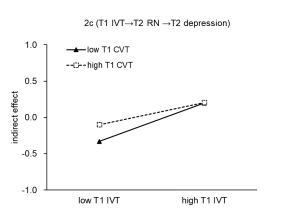 图1 T1个体受害通过T2关系需求满足对T2焦虑(2b)和T2抑郁(2c)的条件间接效应。