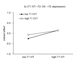 图2 T1个体受害通过T2胜任需求满足对T2焦虑(3b)和T2抑郁(3c)的条件间接效应。