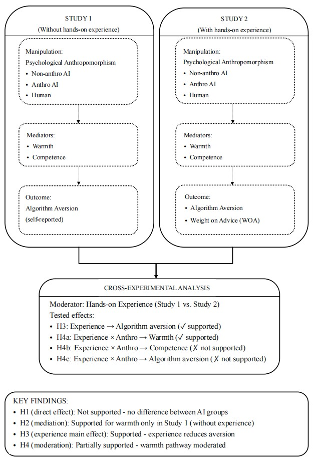 该研究通过两项递进式的行为实验,结合主观态度量表与行为测量(建议采纳权重),系统探讨了在不同经验水平下,拟人化对用户采纳AI建议的影响及其心理机制。研究招募了385名参与者,分别在不提供任何反馈(无经验情境)和完成20轮体重估计任务(有经验情境)后,评估其对拟人化AI、非拟人化AI及人类顾问的信任与采纳程度。