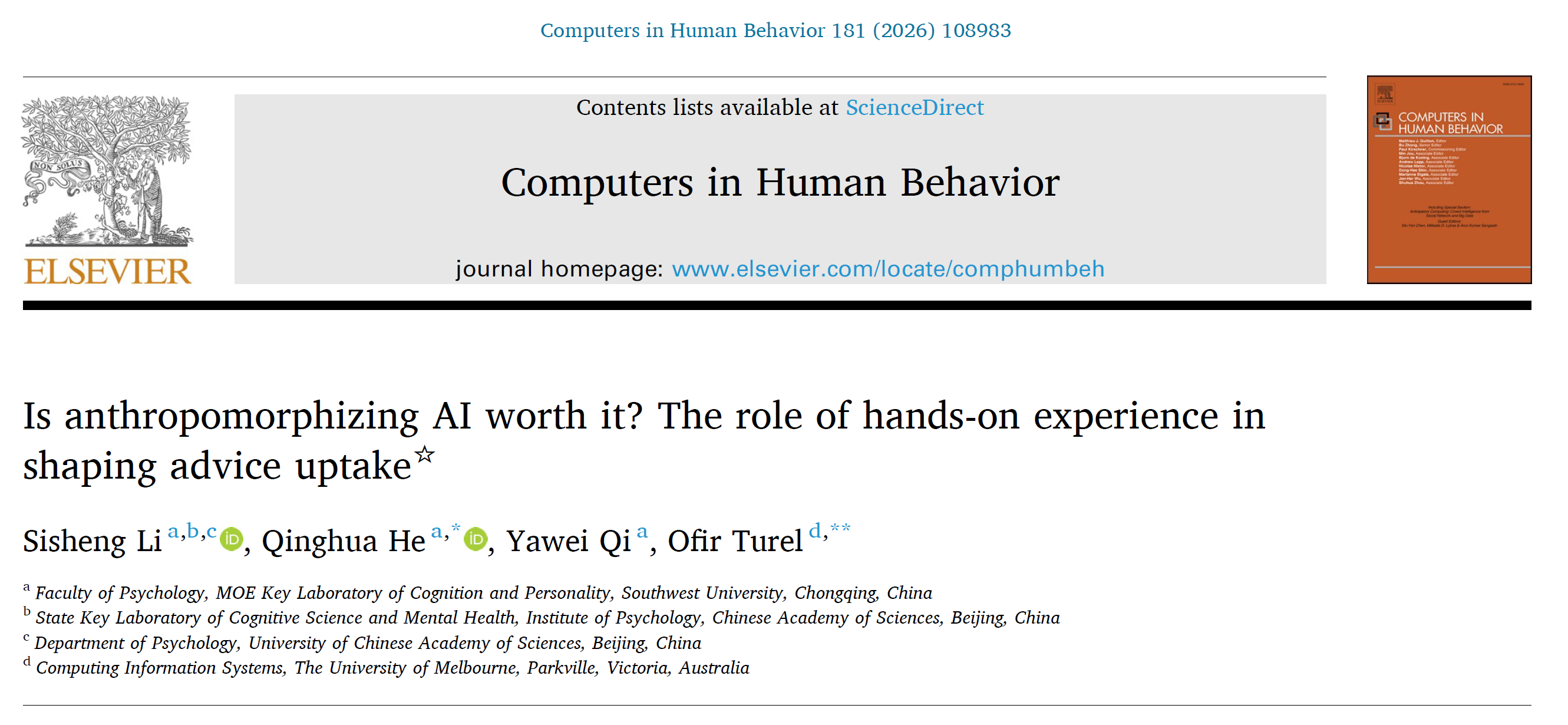 论文信息:Li, S., He, Q.*, Qi, Y., Turel, O.* (2026). Is anthropomorphizing AI worth it? The role of hands-on experience in shaping advice uptake. Computers in Human Behavior, 181: 108983.
